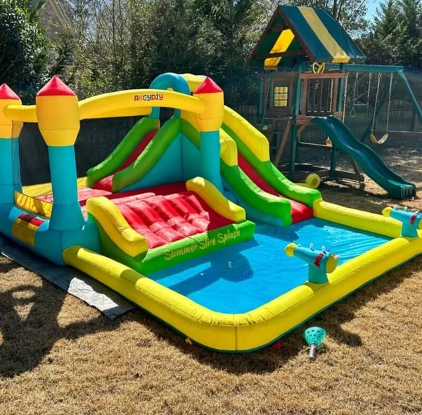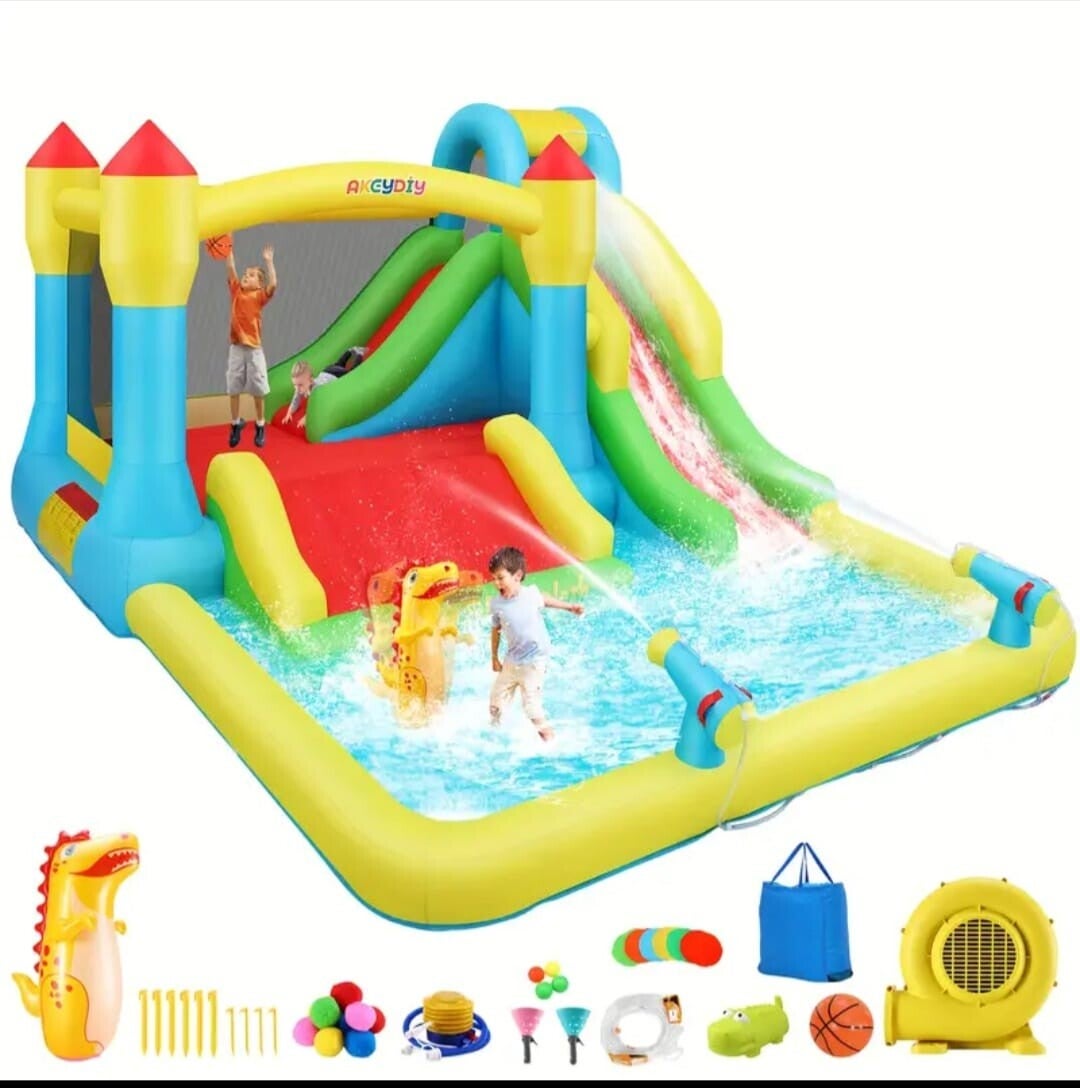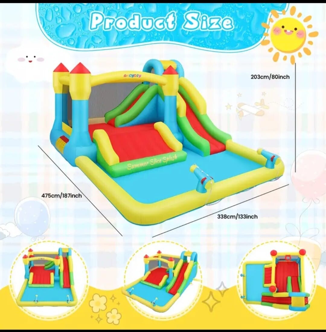187 x 133 x 80 Wet and Dry Bounce House with 3slides, Jump castle wth Swimming pool, Climbing Wall with Basketball Stand